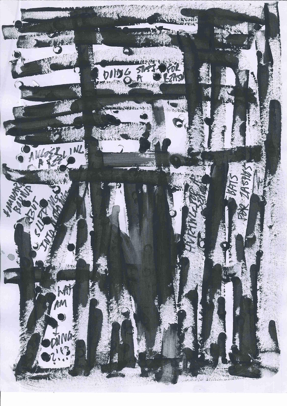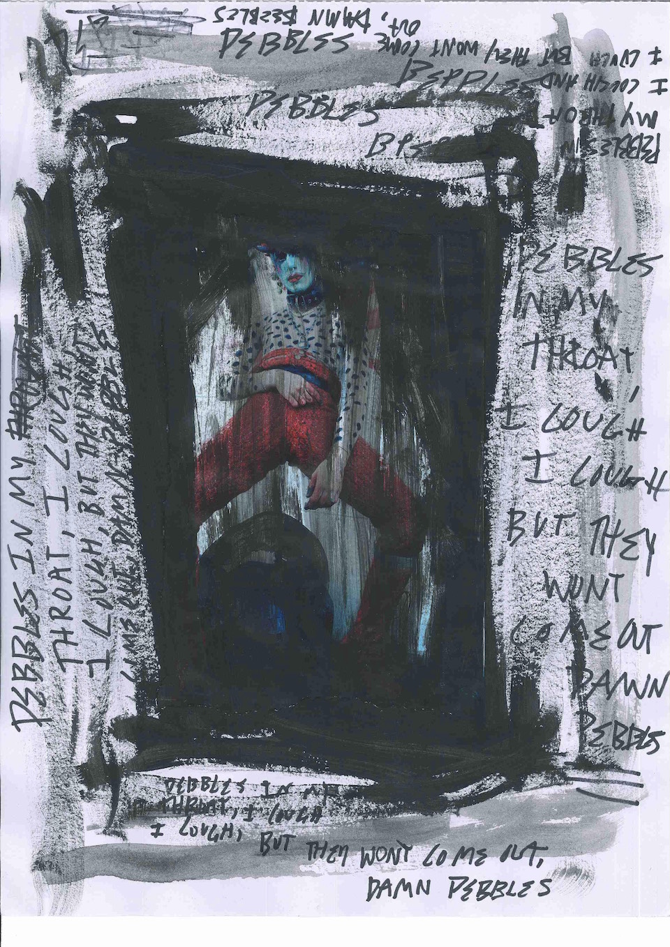 Her print series titled “Pebbles In Aqua Profunda†was done during a time of personal crisis and was made with intuitive mark making accompanied by writing. Regarding the piece as highly personal she says that it confronts her own hardships in life. Used as a healing process, it has given her a means of expressing her personal concerns.