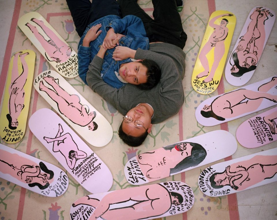 Cheung, who has lived and skated in the California area all his life, created the face of Unity by hand painting naked bodies of various sizes and skin tones in loving embraces on skate decks. These decks featuring boobs, butts, hugs, and words like “Unity: together as one”, display the all-embracing nature and proud queer ethos that Unity has at heart.