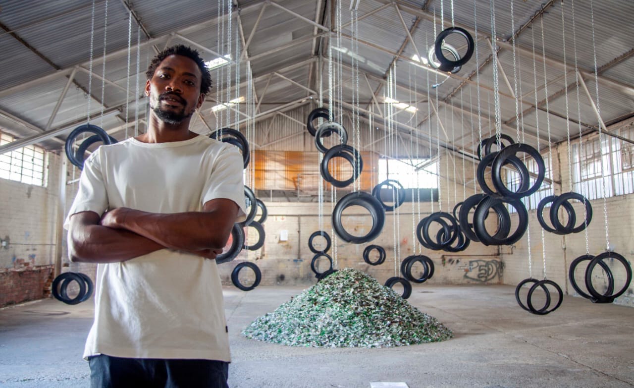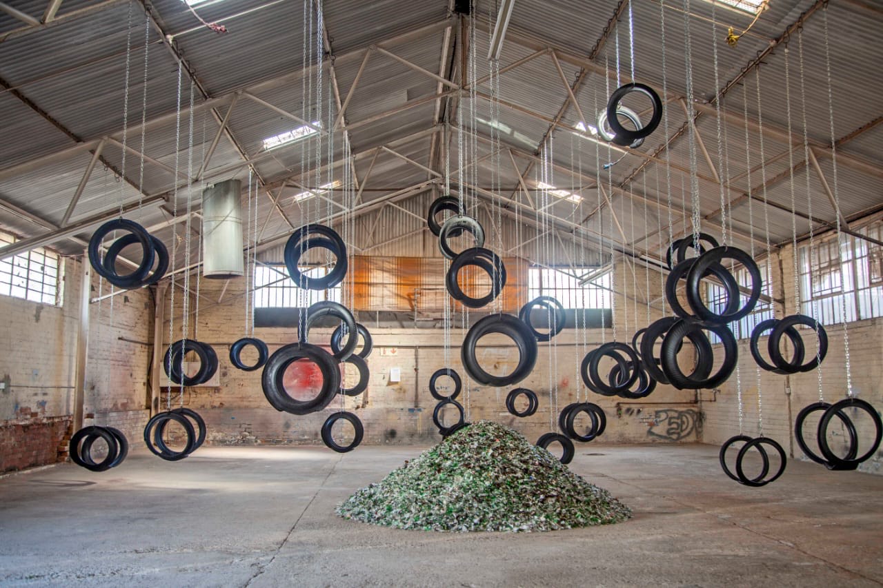 In the installation of repurposed tyres, industrial chains and crushed bottles, 2020’s inaugural Emergent Art Prize winner recalls youthful innocence and how its once impassable virility becomes a labyrinthine-drove of ever present spectres. In his conception of the installation, the artist revisits his childhood playground Katlehong. Along with friends, he would frequently cross train-tracks to go frolic at an adjacent park whose swings the installation swings are modelled after. Â
