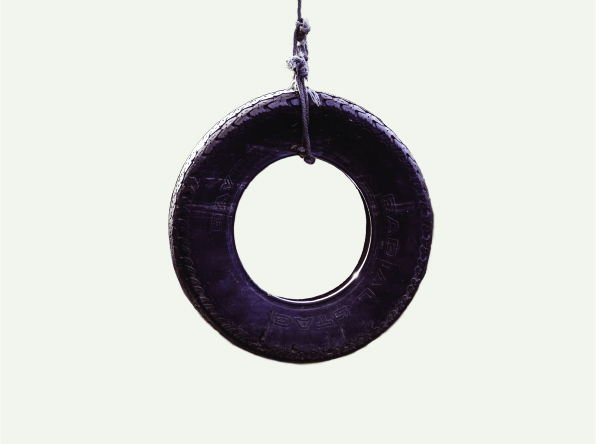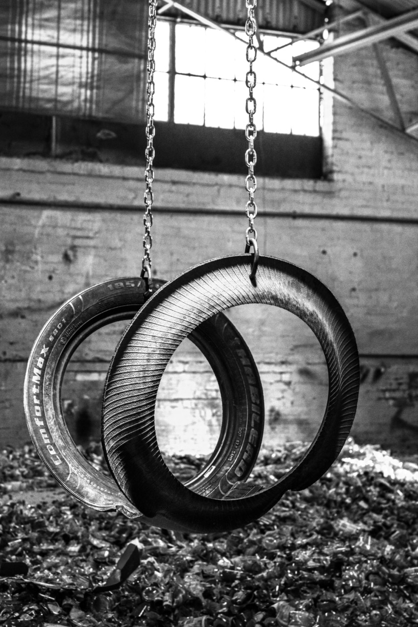 The 33 tyres that make up part of Traces in the Still Air are cut into seats to make swings. They are suspended from the roof of the 13 Viljoen street warehouse in Lorentzville where the installation is exhibited. Some swings hang less than a few centimetres off the ground while others are anchored so high up they almost cling to the roof. A heap of broken glass bottles lies somewhat isolated in the midst of the tentatively playful renditions of childhood moments-cum-memories.Â