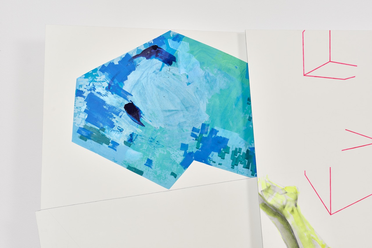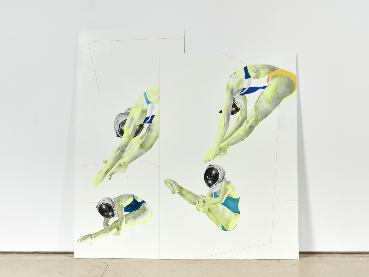 She’s also become increasingly interested in the idea of a swimming pool, which has recently emerged as a recurring object in her practice. This piece, for example, is site-specific, created according to the gallery’s dimensions. It consists of three panels, with a deliberately loose hanging meant to mimic the movement of water.â€