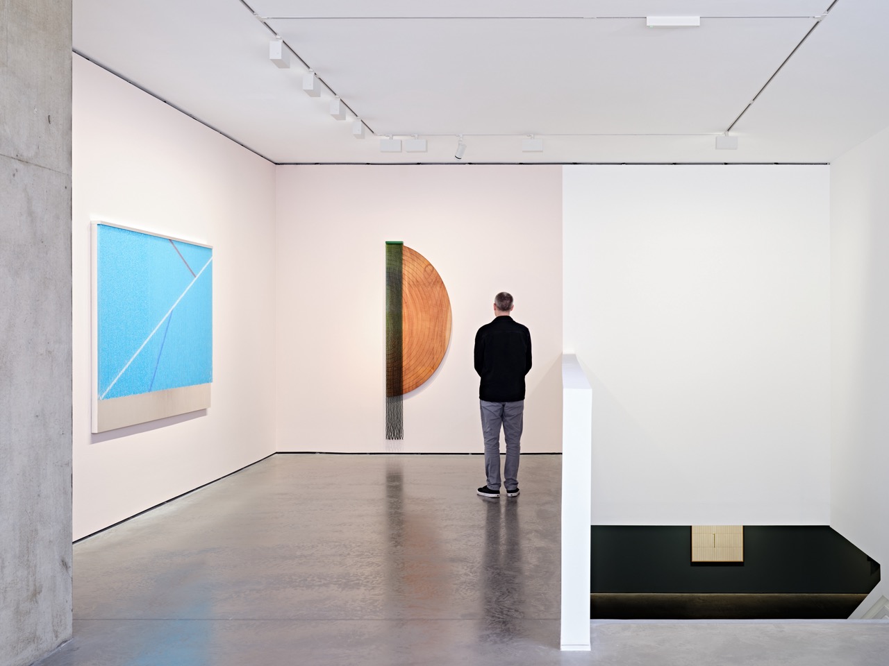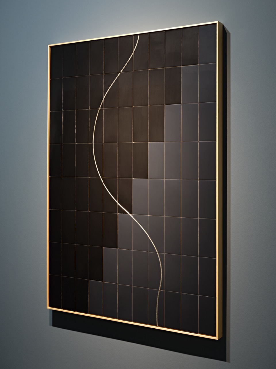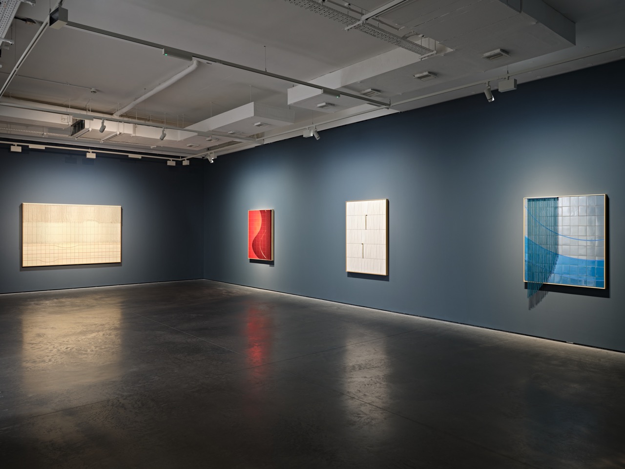 Simultaneously, ‘Magma’, ‘Rift’, ‘Cascade’, ‘Dune’, ‘Canopy’ and ‘Astres’, which are being presented on the lower level of the gallery, are borrowing from various physical, raw elements including handmade ceramic tiles, acrylic, metal leaf, rope and wood frame so that they can summon the rural environment as a facet within the building of macrocosms and cosmogonies.Â