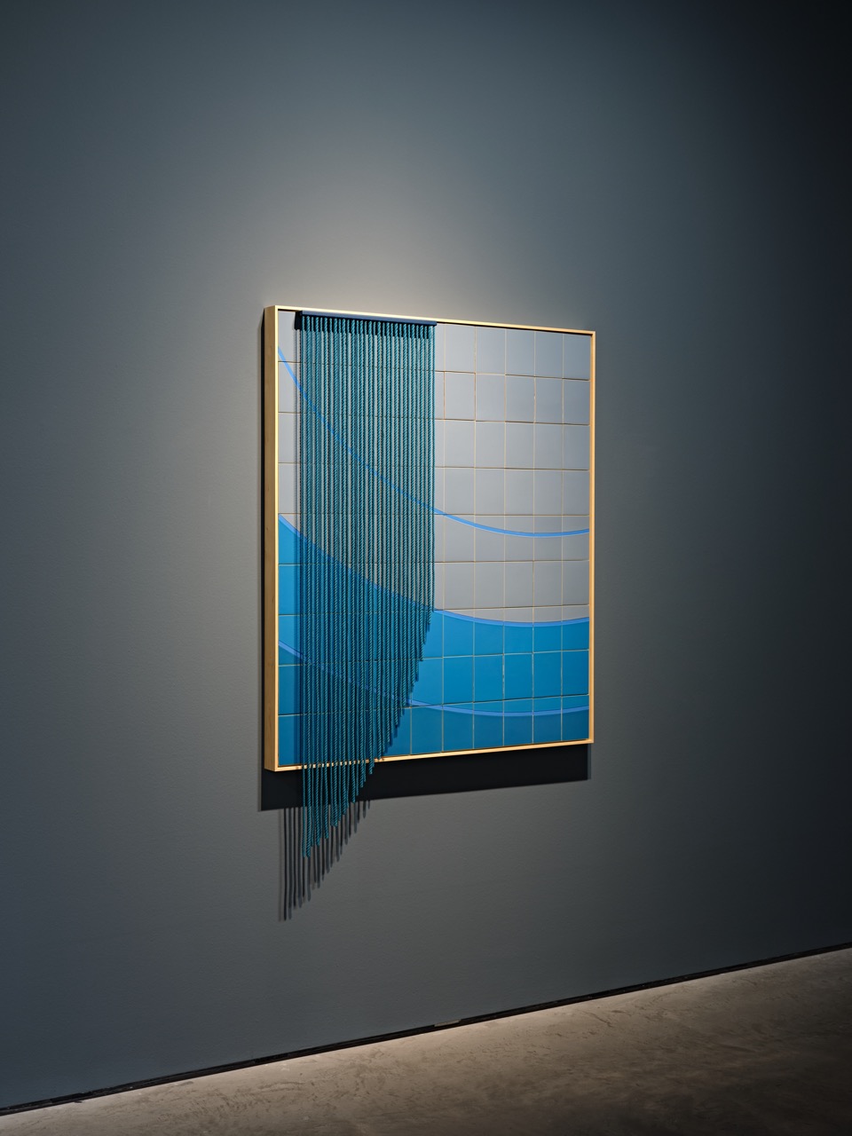 Simultaneously, ‘Magma’, ‘Rift’, ‘Cascade’, ‘Dune’, ‘Canopy’ and ‘Astres’, which are being presented on the lower level of the gallery, are borrowing from various physical, raw elements including handmade ceramic tiles, acrylic, metal leaf, rope and wood frame so that they can summon the rural environment as a facet within the building of macrocosms and cosmogonies.Â