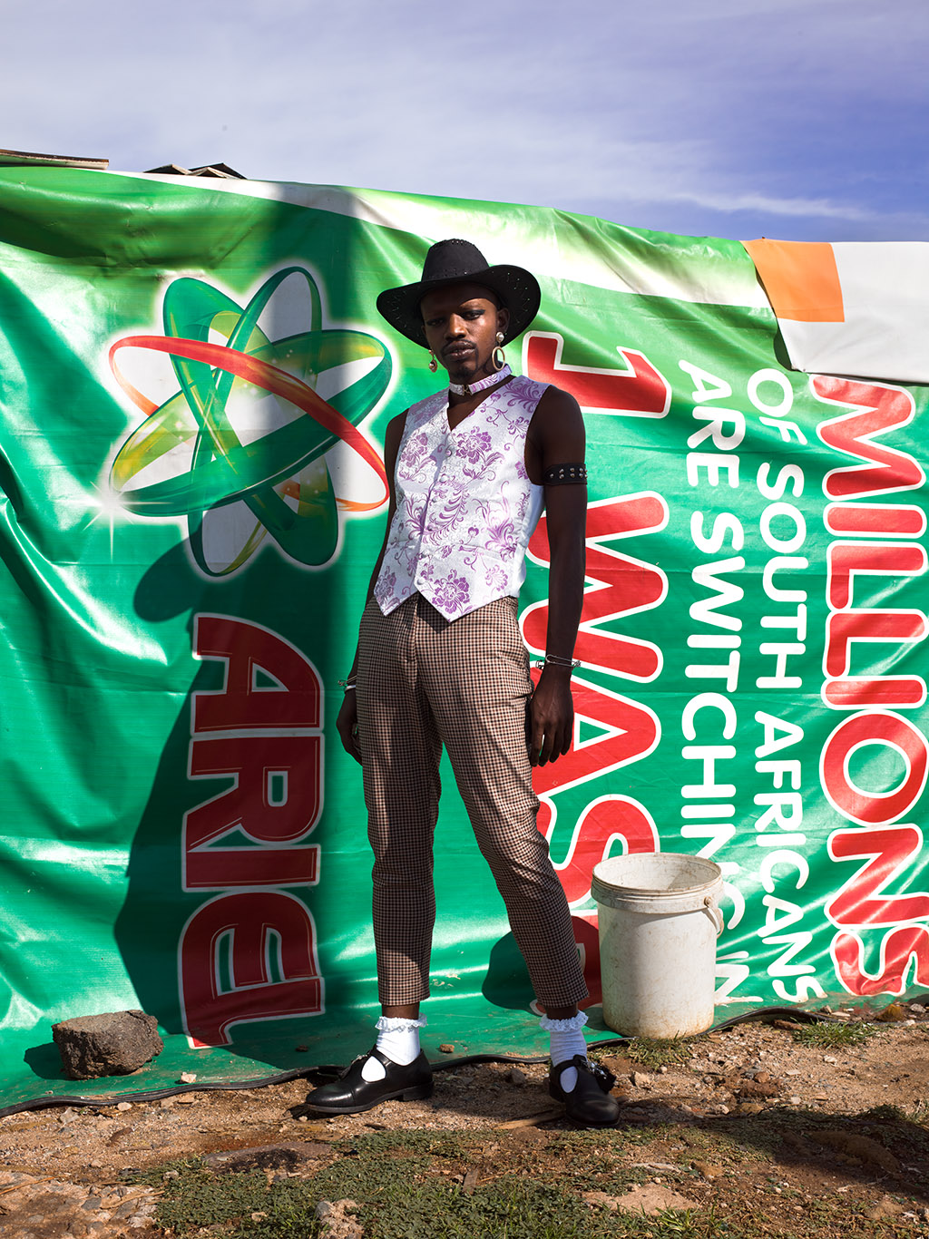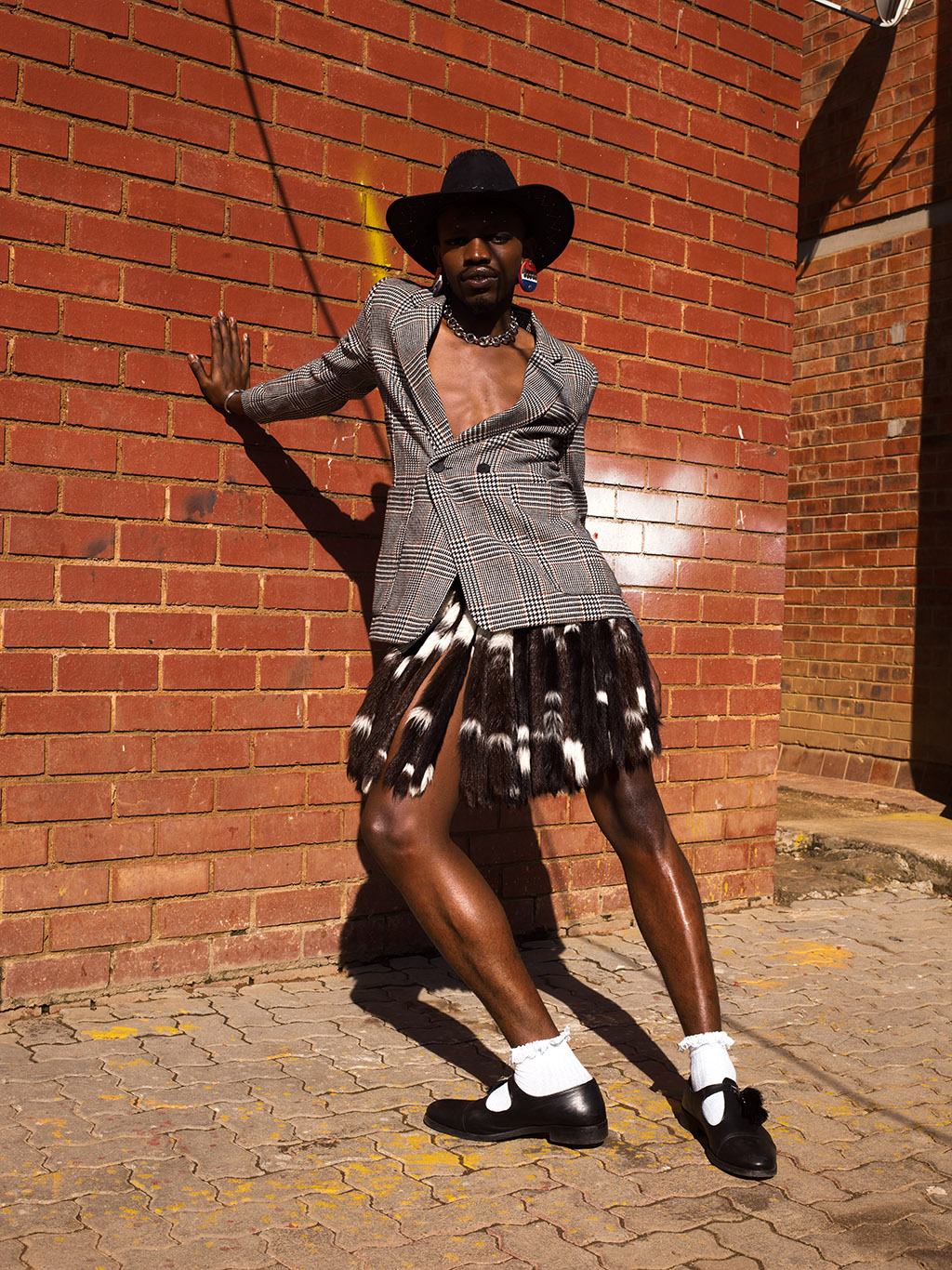 Look 3: Desire Marea in Check blazer by H&M, Ibheshu, Ruffle socks, Cowboy hat and earrings stylist own, Shoes and accessories are models own.