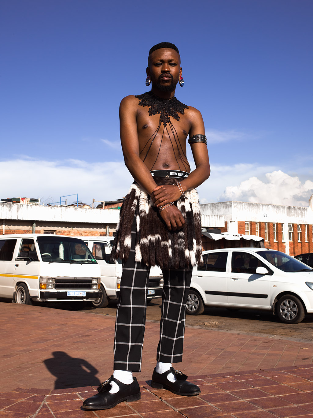 Look 2: Fela Gucci in Check trousers by H&M, Ibheshu, Ruffle socks, body chain and earrings stylist own, Shoes and accessories are models own.