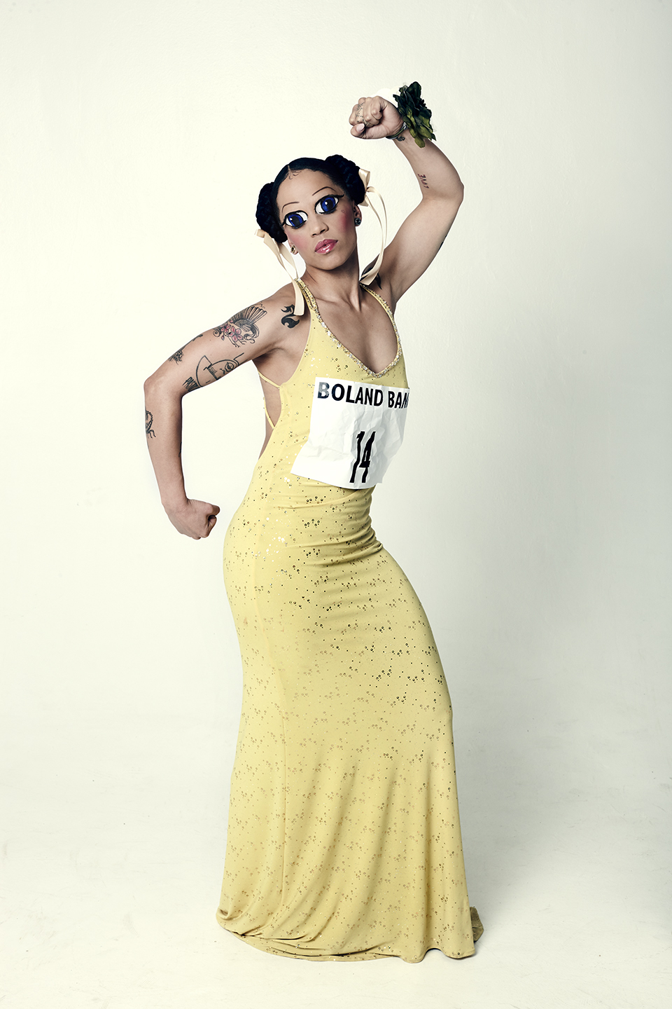 Look 3: Tarryn wears green jumpsuit for the David Tlale archive, shoes and accessories stylists own.